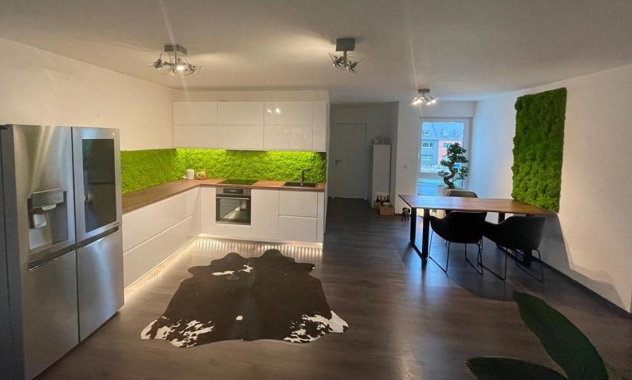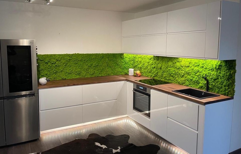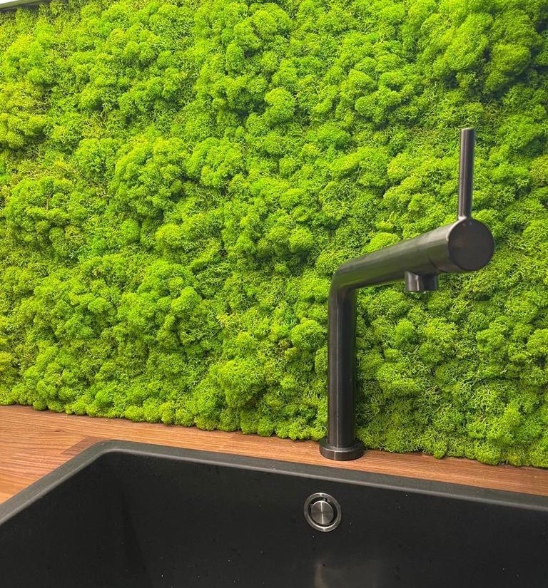 Cuadros, paneles o paredes enteras de musgo de reno le aportan a comedores y cocina minimalistas ese toque natural que aveces falta en este estilo. Este poderoso contraste impresionará a tus invitados.